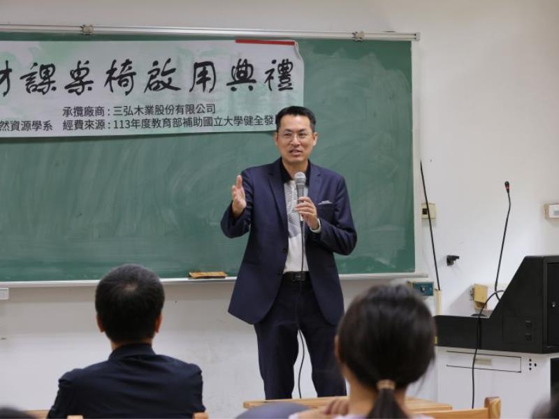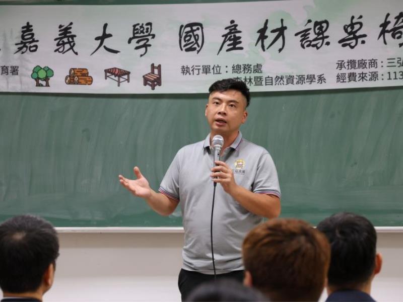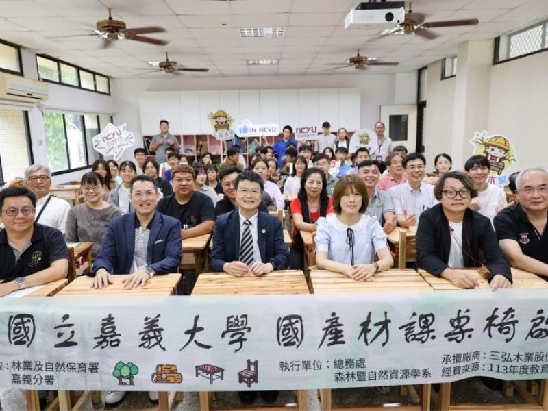 為呼應淨零碳排與綠色永續發展目標,嘉義大學森林暨自然資源學系9月24日進行教室內課桌椅汰換,改採由國產柳杉木材製作的木質課桌椅,取代傳統塑膠與金屬製品,成為全國高等教育機構中首例以臺灣木材打造教學設備的典範。