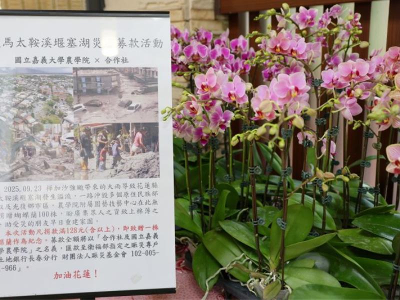 花蓮光復鄉馬太鞍溪堰塞湖日前發生溢流,造成光復鄉重大傷亡及損失,全民同表悲痛。嘉義大學農學院園藝技藝中心與動物試驗場為積極響應花蓮賑災愛心捐款,無償捐出100株蝴蝶蘭與66瓶嘉大鮮乳,攜手熱心公益的嘉大員生消費合作社作為認捐平台,即日起歡迎至合作社捐款滿128元(含以上)即可領取1株蝴蝶蘭作為紀念,或認購1瓶嘉大鮮乳合作社即捐出90元(含以上),希望匯聚各方愛心,緩洪災之急難。