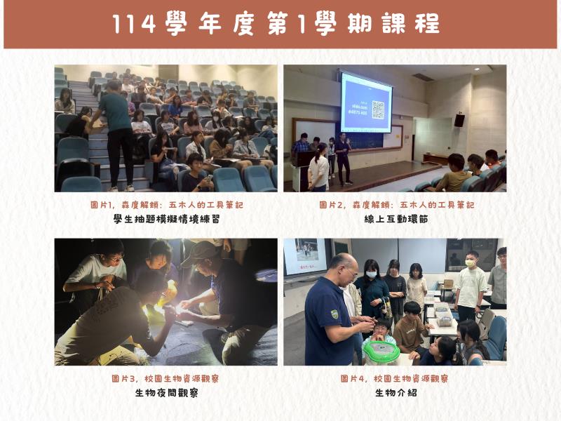 ※「校園生物資源觀察」(生物資源學系張素菁老師):以蘭潭校區為起點,引導學生進行實地生態調查,從植物到動物多樣性,深入認識校園環境與系所專業方向。