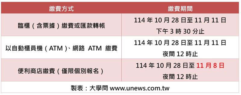 繳費方式有三種,請留意截止期限,若有手續費須自付。