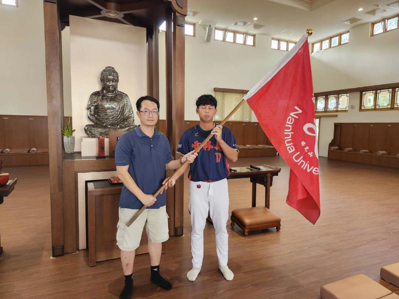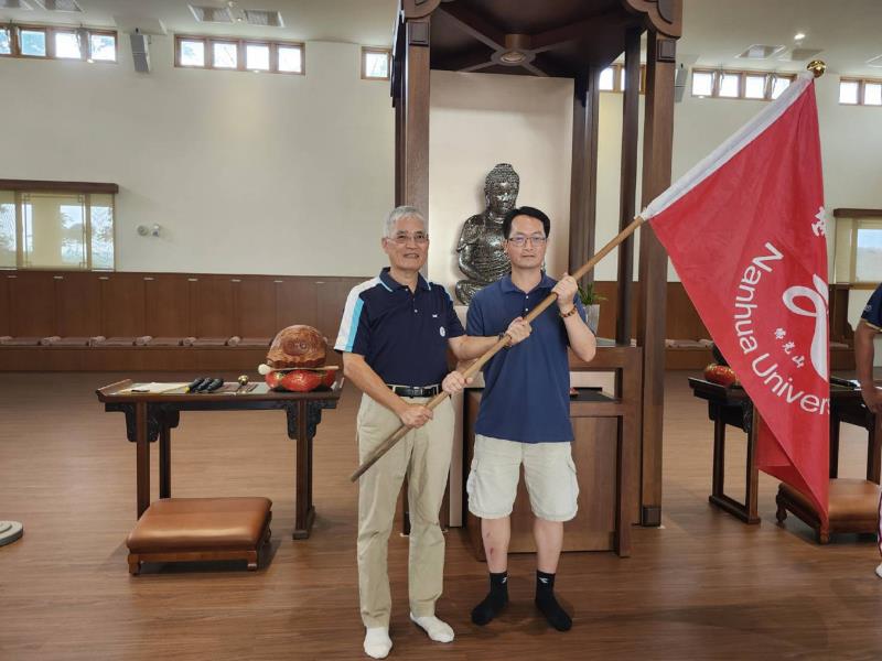 南華大學授旗全運會代表隊,運動學程許伯陽主任(左)授旗給選手代表廖昭雄(右)。