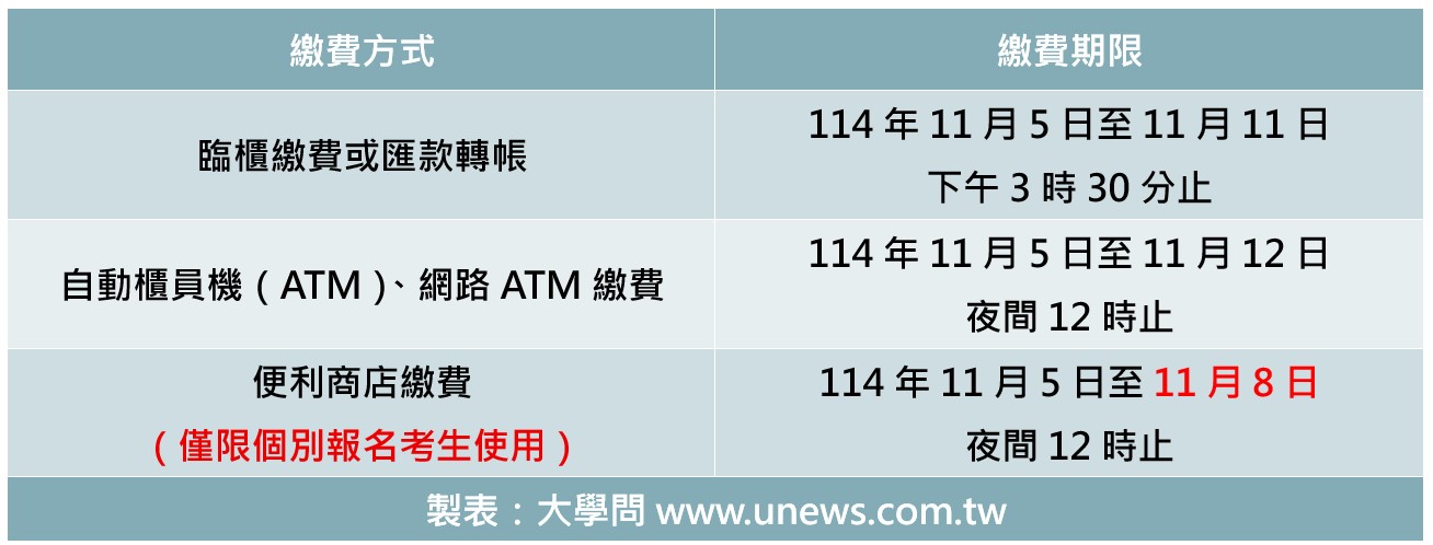2.若非華南銀行帳戶採匯款轉帳繳費,或於便利商店繳費,皆須自付手續費。考生繳費後,收據請妥善留存。