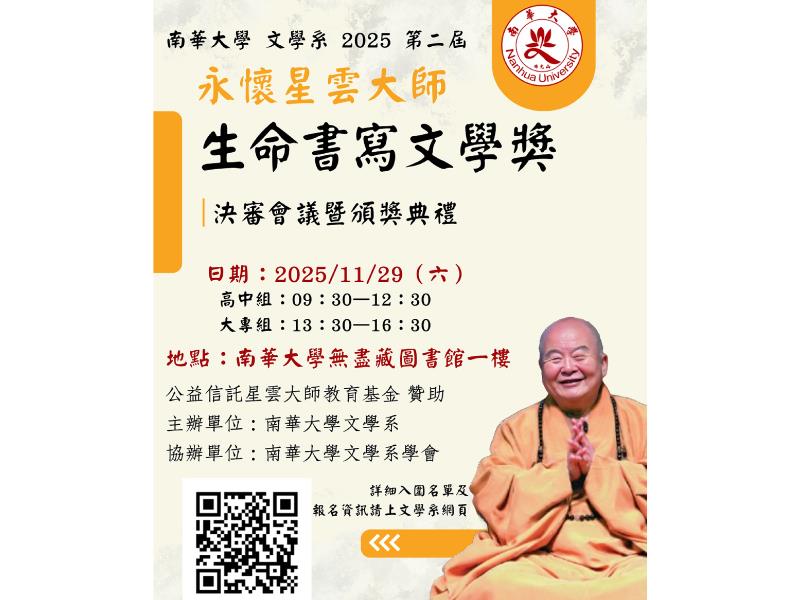 南華大學文學系2025 第二屆永懷星雲大師——生命書寫文學獎決審會議暨頒獎典禮活動海報