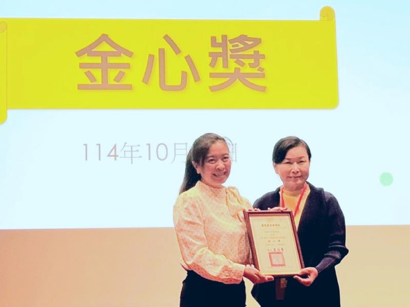 南華大學獲頒「金心獎」,賴淑玲副校長兼圖書資訊處處長代表學校接受表揚(右)。