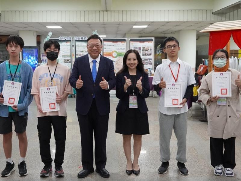 ▲中華大學表揚導覽員(學生由左至右:光電與材料工程學系林鴻源、應用日語學系曾翊修、電機工程學系李博宇、觀光學院碩士班尹文麗)的專業與熱忱,肯定學生在永續教育中的主動參與與實踐精神。