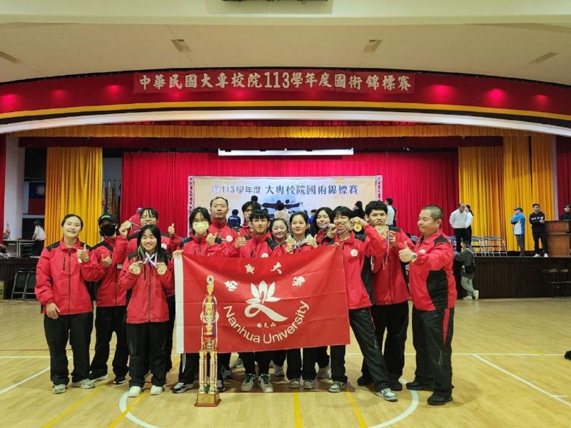 南華大學運動選手展現亮眼成績,國武術隊連續兩年獲大專盃國術錦標賽團體總冠軍。