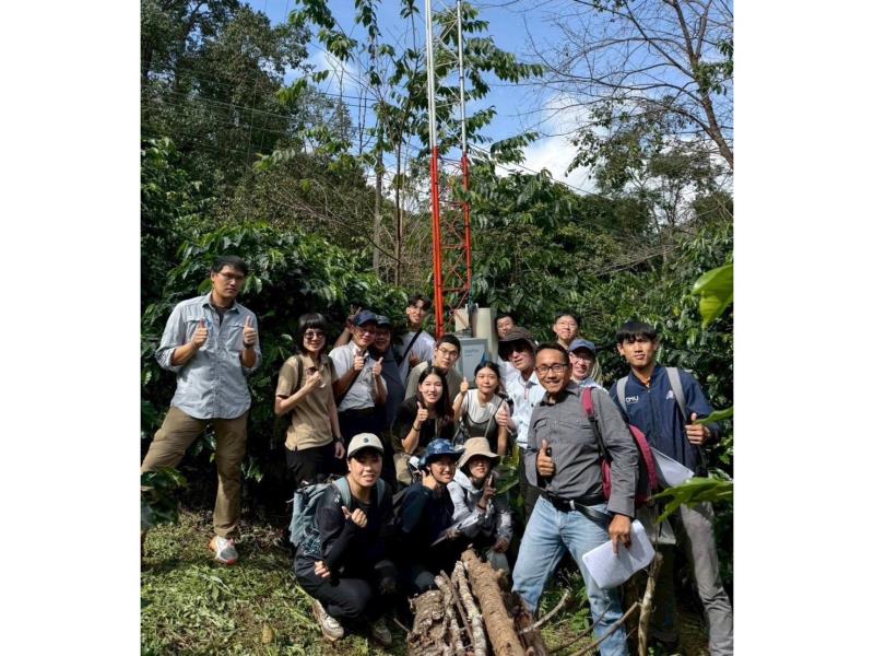 圖5:嘉大師生訪團與清邁大學高地農業團隊在Khun Chang Kian高地農業研究中心咖啡園中的溫室氣體通量塔前合影。