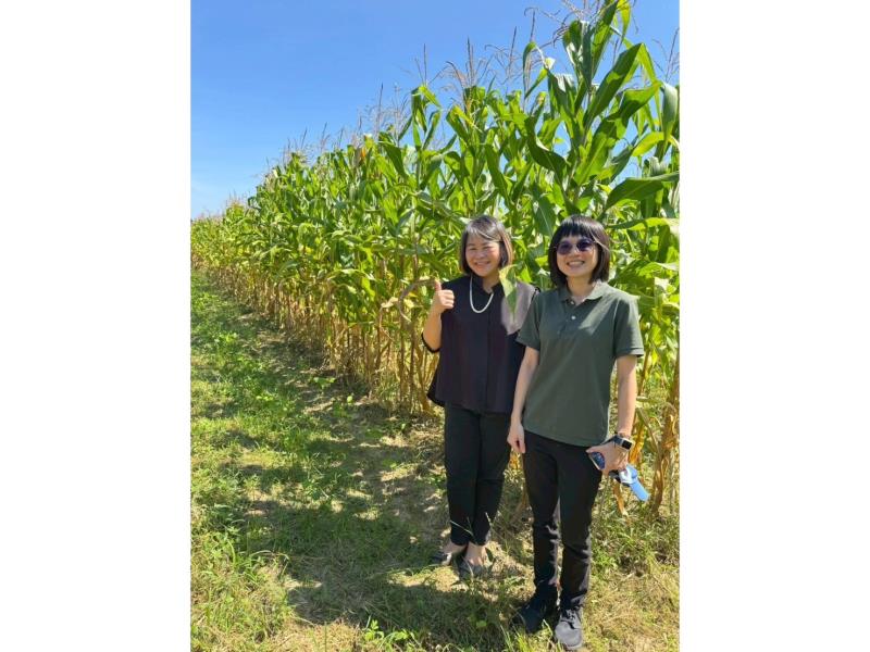圖6:嘉大農藝系曾鈺茜副教授與清邁大學農學院副院長Associate Prof. Tonapha Pusadee在作物中心實驗田,針對雜糧間作體系溫室氣體排放有深入討論。
