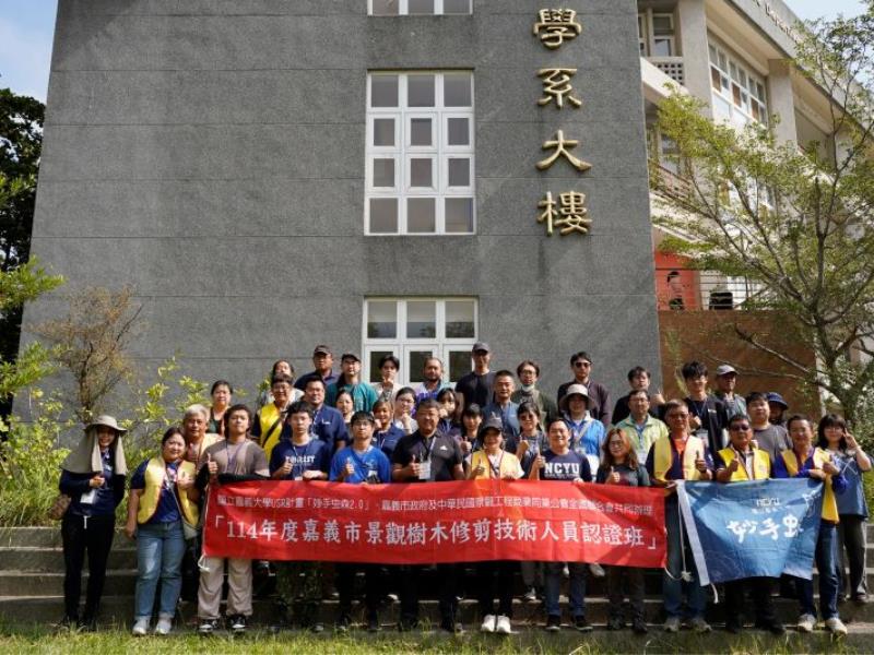 嘉義大學USR計畫「妙手虫森2.0:Revive! 永續環境健康帶回『嘉』」長期關注城市綠化與生態安全議題,10月30日至31日與嘉義市政府、中華民國景觀工程商業同業公會於嘉大蘭潭校區舉辦「114年度嘉義市景觀樹木修剪技術人員認證班」,共同推動城市綠化專業培訓。