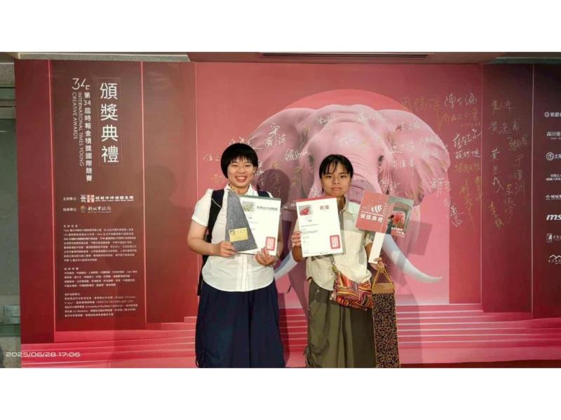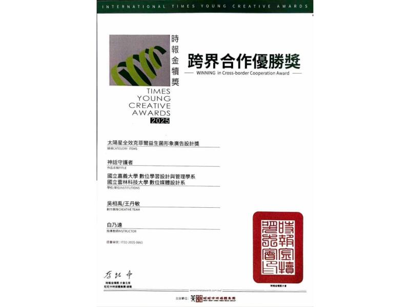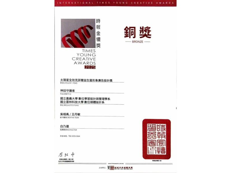 嘉義大學師範學院數位學習設計與管理學系吳相禹同學,與雲林科技大學數位媒體設計系王丹敏同學組隊,勇奪2025年「時報金犢獎」形象廣告設計獎銅獎殊榮。這項被譽為業界「青年創意奧斯卡」的國際級學生競賽,吸引全球超過72萬人、10萬餘件作品角逐,能在激烈競爭中脫穎而出,展現嘉大學生兼具創意與實力的亮眼表現。