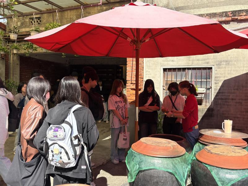 南華大學學生至「丸莊醬油」參訪,學生們品嚐發酵缸中的醬油,味道更濃郁甘醇。