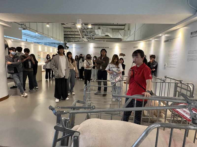 第二站即前往由祥圃實業打造的「良作工場農業文創館」,該場域結合農產加工、教育導覽與文化展覽,推動台灣豬肉產業的透明化與品牌價值。大學生透過互動展示與導覽,瞭解台灣豬隻從飼養、屠宰、冷鏈運輸到產品加工的完整流程,並深入認識「從農場到餐桌」的食安概念與永續理念。此外,學生也參與館內的創意手作活動,體驗如何將農業元素轉化為文創設計,展現農業加值的新可能。