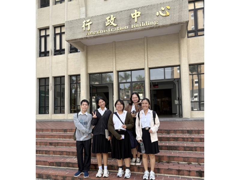 圖7:五位來自泰國清邁大學農學院的大三交換生,由左至右分別為Mr. PATIPAT、Ms. WASINEE、Ms. PATCHARAPA、Ms. KAMOLRAT、Ms. NETNAPHA,來訪嘉大的第一天於行政中心前合影。