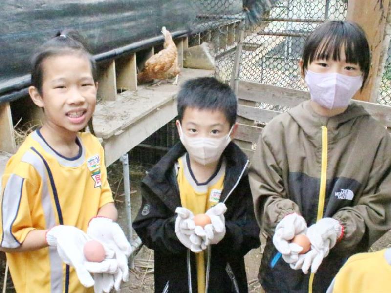 學童對於雞隻會挖小沙坑進行沙浴啄蟲,也會怕被打擾而躲到隱私空間下蛋等行為,都聽得津津有味。在嘉大食農教育推廣團隊指導下,學童有了初次撿拾雞蛋的體驗,他們驚訝的發現,原來剛被產下的雞蛋是溫熱的,而且還有些許的濕潤感。