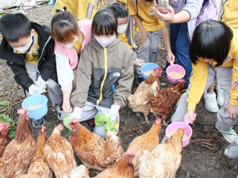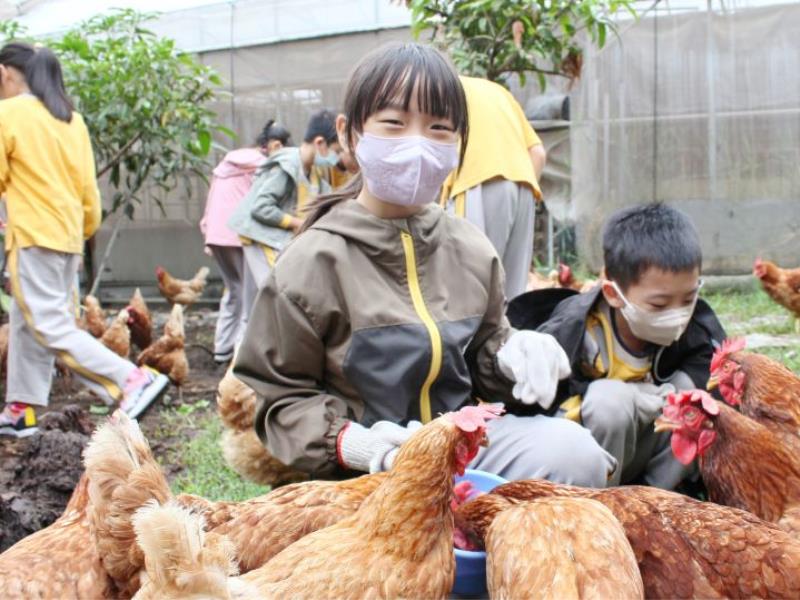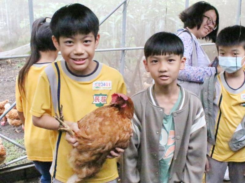 嘉大新民溫室生態多元,不施作農藥及化學肥料,平日靠噴灑益生菌防止蔬果病蟲害及維護雞舍清潔。在教育部高教深耕計畫A主軸食農產業管理學程經費補助下,本次新民溫室的教學內容,除了安排菜苗定植、香草解說及育苗室參觀外,最讓民族國小學童雀躍的就是踏入雞舍撿拾雞蛋、以及拿菜葉飼料親手餵雞的過程。