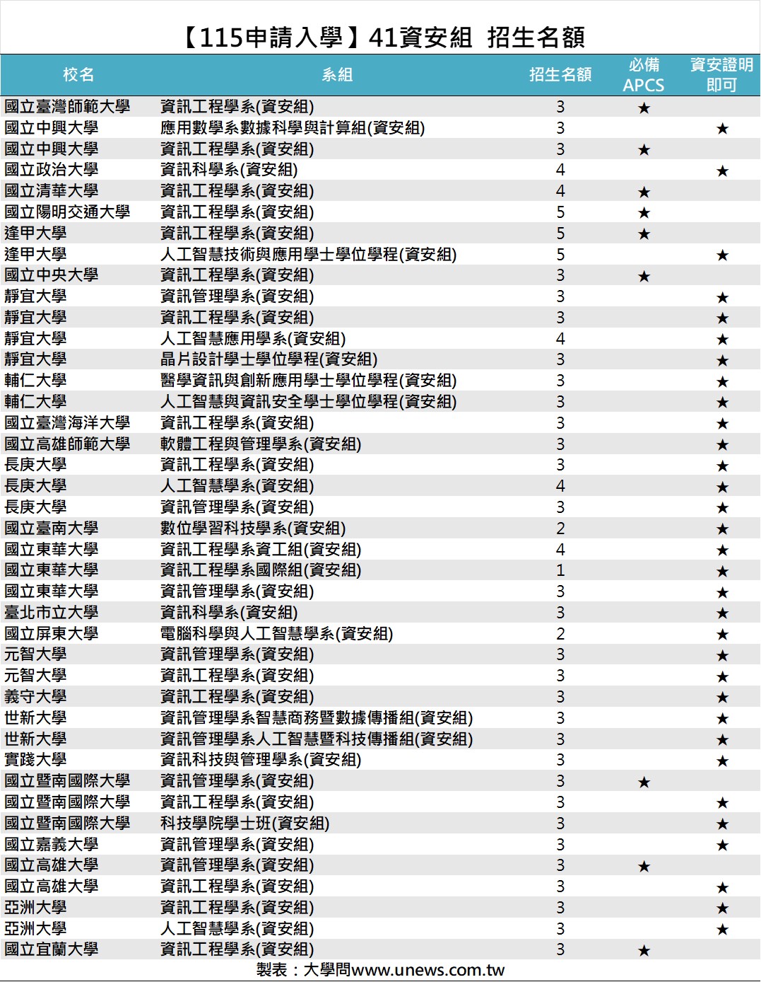 / 情報 / 大學考情 / 【115申請入學】41系資安組 招生130名
