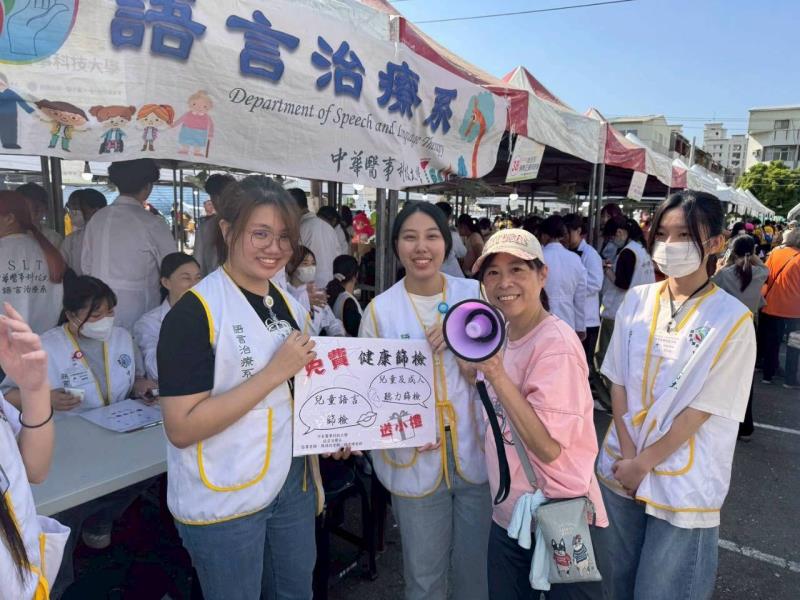 中華醫事科技大學語言治療系於 11 月 15 日受邀參與年度大型公益活動──創世基金會園遊會,設立「語言與發展篩檢服務站」,提供成人聽力篩檢與兒童發展篩檢。活動現場湧入許多民眾與家長,排隊體驗專業篩檢,氣氛熱鬧溫馨。