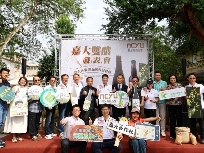 嘉義大學今(21)日在蘭潭校區員生消費會合作社沁心池廣場舉辦「嘉大雙釀新品發表暨多元產品開發發表會」,推出全新農糧產品,包括「嘉大銀禧精釀啤酒」、「晶珠美人純米大吟釀」、「國產韓式高麗菜泡菜」及「無麩質戚風蛋糕」等。活動由臺南區農業改良場陳昱初場長、嘉義大學林翰謙校長、台灣菸酒公司桃園酒廠吳政憲廠長、蘇甲辛行銷企劃師、嘉大傑出校友會劉芸富校友等貴賓及產學團隊共同揭幕,展現嘉大在永續農業、食品加工與產學合作上的研發成果。活動規劃「國產米糧多元產品展示區」及「食農永續教育展示區」,完整呈現嘉大從育種、農藝、發酵、加工到產品化的跨域整合能力,吸引產官學界共同參與。