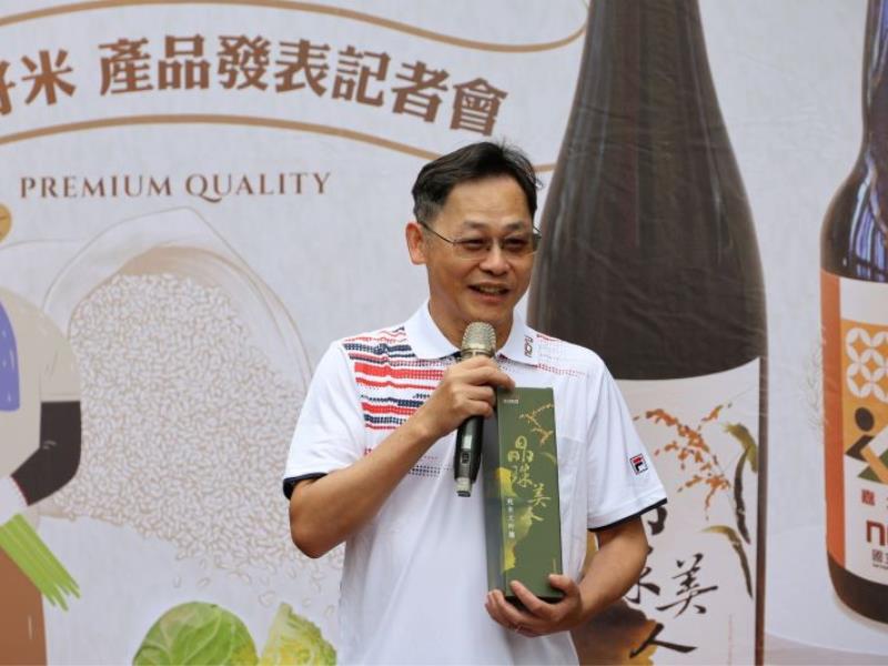 圖4:嘉大農藝學系黃文理教授說明「晶珠美人純米大吟釀」採用釀製清酒專業設備進行45%高精米步合碾米(四刈五分)碾製,取其最精華的米心釀造。