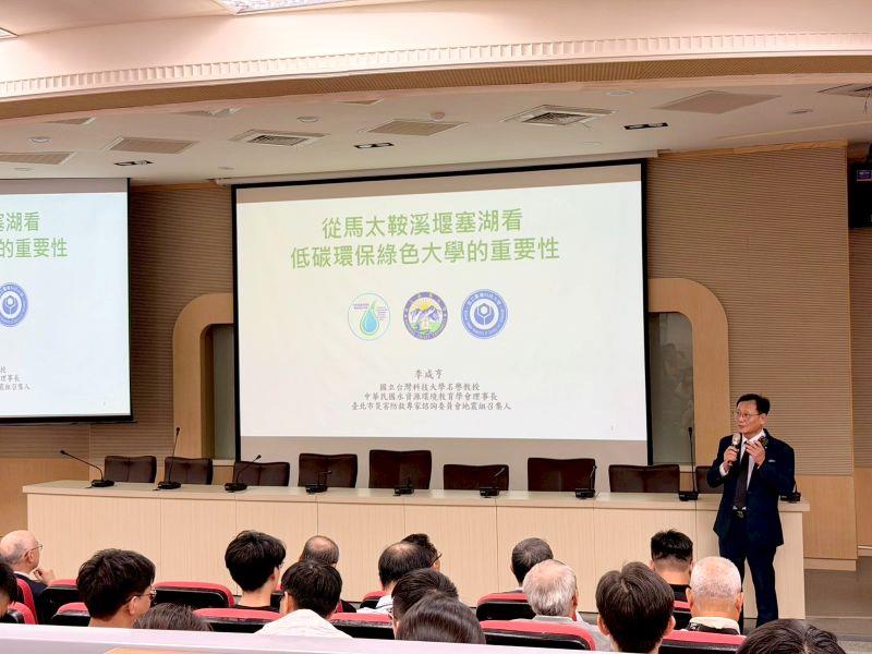 圖2:李咸亨教授以「從馬太鞍溪堰塞湖看低碳環保綠色大學的重要性」為題進行專題演講。