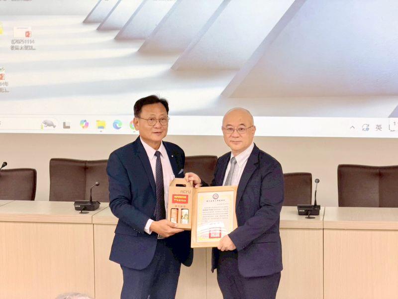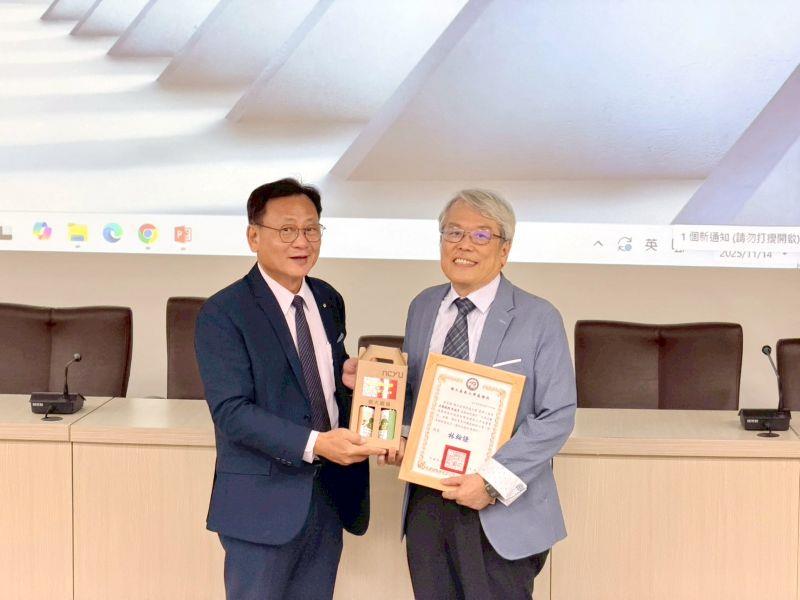 圖4:洪滉祐副校長致贈李有豐教授感謝狀及紀念品「嘉大銀禧精釀啤酒」。