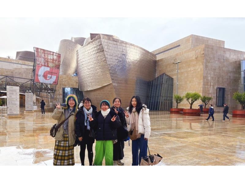 圖6:嘉大視藝系師生於西班牙畢爾包古根漢美術館前合影(由左至右張?予老師、學生林庭薰、陳欣、朱芳瑩及游芷瑜)。