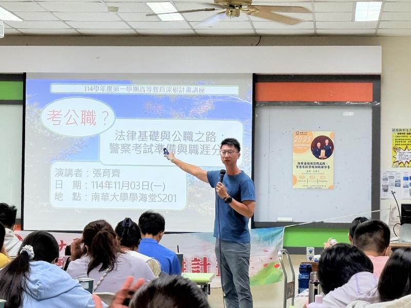南華大學社科院推國考司法模組課程,邀請國際事務與企業學系畢業系友張育齊分享考取警察特考的經驗。