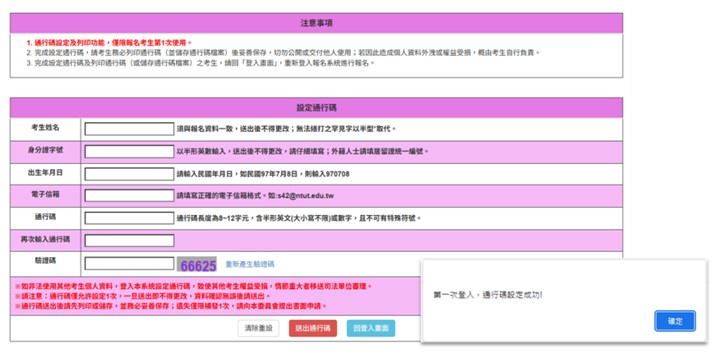 1.之後進入網站作業系統均須輸入通行碼,且通行碼僅能設定1次,請考生務必妥善保管。可按下「列印通行碼留存」另外儲存。