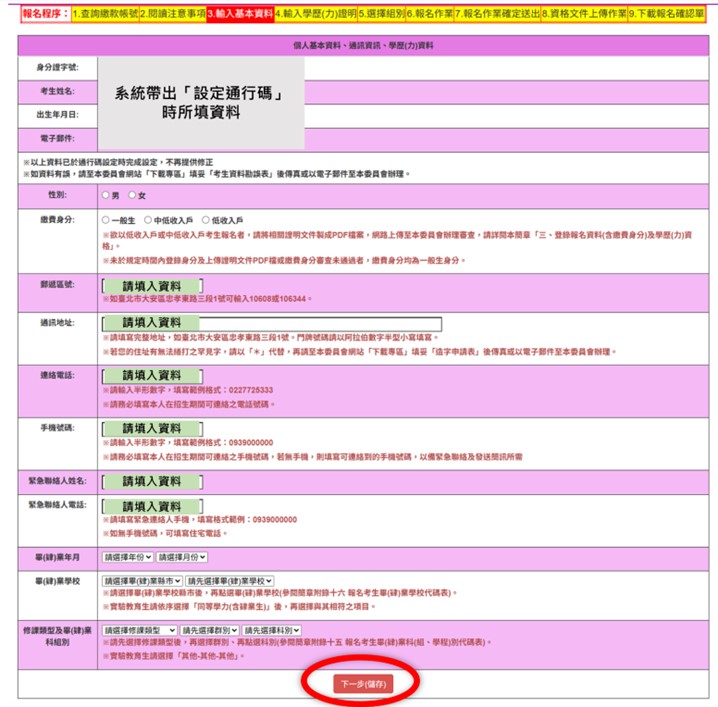 1.繳完費2個小時以後,再次登入報名系統,詳閱注意事項後並勾選按下「同意」,即可開始輸入報名資料及學歷資格。2.請先檢查個人基本資料並選擇繳費身分,填寫聯絡及通訊資料、畢(肄)業學校、修課類型及畢(肄)業組別。填寫完畢請按「下一步(儲存)」。