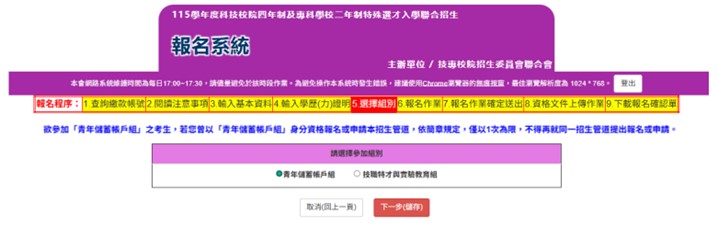 招生包括「技職特才及實驗教育組」、「青年儲蓄帳戶組」兩組,每位考生僅可選擇1組報名,最多選擇5個校系科(組)、學程報名。