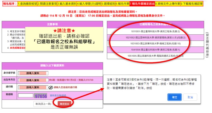 4.確認送出時,請再仔細閱讀注意事項並確認報名校系科(組)或學程名稱均正確無誤後,請輸入驗證資料並按「確定送出」。