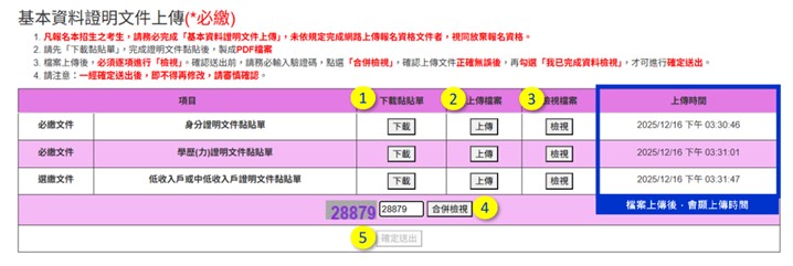 先點選各項文件的「下載」,將所需「黏貼單」下載後並列印,然後將證明文件影本貼在黏貼單上,掃描後製成PDF電子檔並按「上傳」,依序上傳各項文件檔。檔案若上傳成功則右側會顯示上傳時間。上傳完畢後,請點「檢視」確認檔案。最後輸入驗證碼點選「合併檢視」,確認資料無誤後,才可「確認送出」,完成基本資料證明文件的上傳作業。