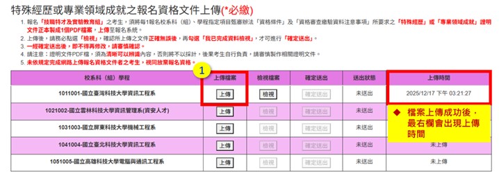請「技職特才及實驗教育組」的考生自行將該校系組規定須繳驗的證明文件掃描並製成一個PDF檔(相關規定務必詳閱招生簡章),再點選「上傳」。上傳完畢請按「檢視」確認檔案是否正確,確定無誤後請按下「確定送出」。