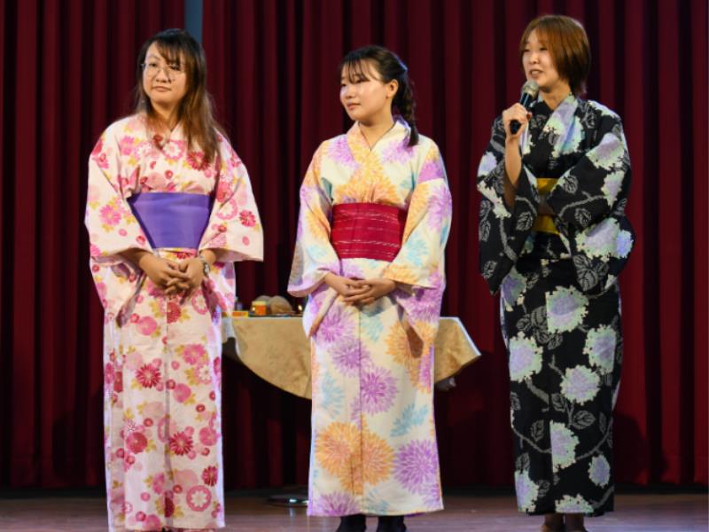 外文系學生展示傳統浴衣(由左至右:外文一賴品岑,交換生松下佳加,交換生熊谷玲南) Foreign Language Department students showcase traditional yukata.