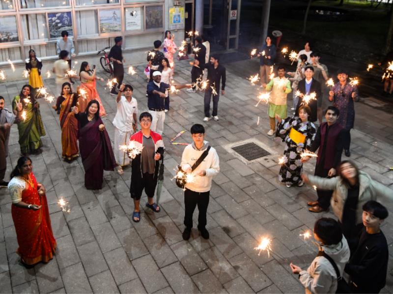 活動由印度學生介紹排燈節(Diwali)的由來,並帶領進行傳統祭拜儀式(Pooja)揭開序幕。會場以油燈(Diya)、萬壽菊花環,以及由本校印度學生親手製作的傳統地畫「藍國麗」(Rangoli)妝點,營造出濃厚且莊重的節慶氛圍。印度學生團隊亦精心準備道地手作印度點心與香料茶(Masala Tea),香氣四溢,吸引眾多師生排隊品嚐。學生們同時安排了魔術與舞蹈表演,傳遞排燈節象徵的喜悅、光明與共享精神。