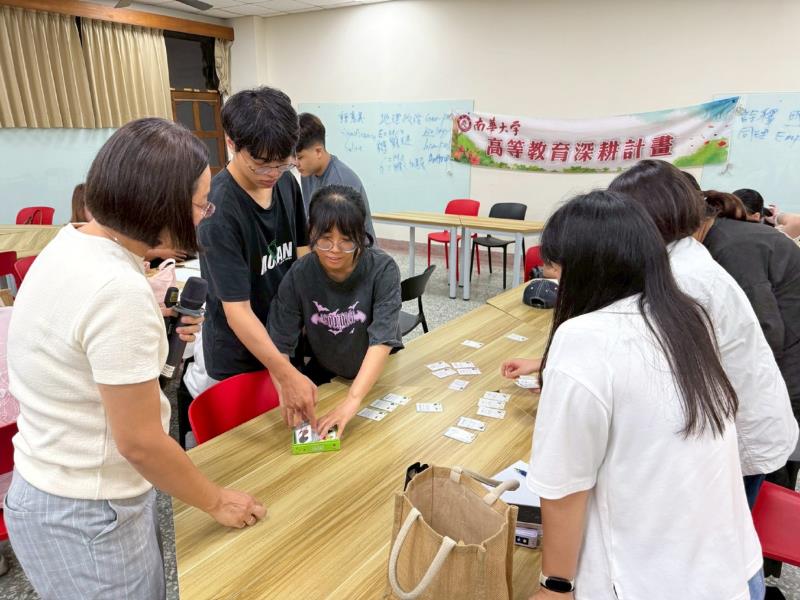 南華大學職涯培力升級,深化學生職涯競爭力,辦理職涯探索工作坊,講師引導學生透過卡牌認識自己。