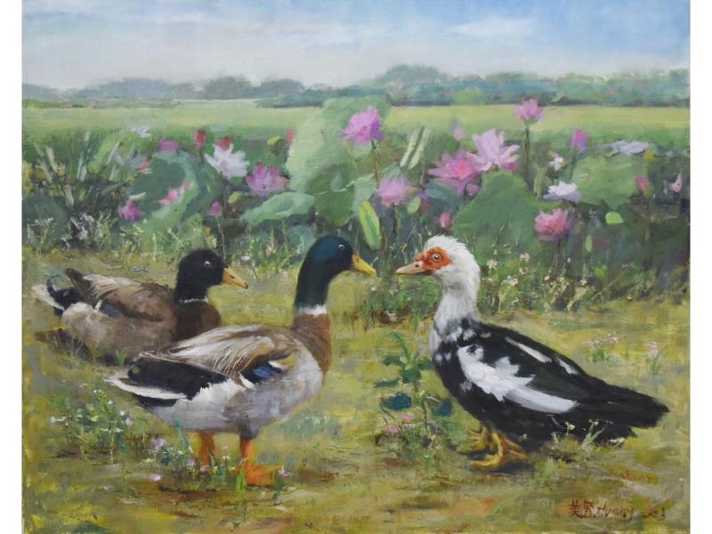 圖6:《鴨戲蓮畔》 黃美賢 100X80 CM 2023 油彩畫布。
