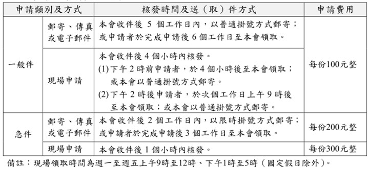 一般件每份100元;若為急件,現場申請每份300元,郵寄、傳真或電子郵件等申請方式則為200元。