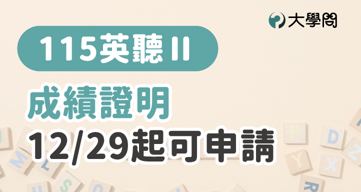 考生若需要115學年度英聽測驗第二次考試的成績證明,可以向大考中心申請,有中文版及英文版兩種。114年12月29日起即可申請,申請期限自考試當年度起5年為限,只限考生本人辦理。若時間急迫,可於現場申請急件,但費用較高。