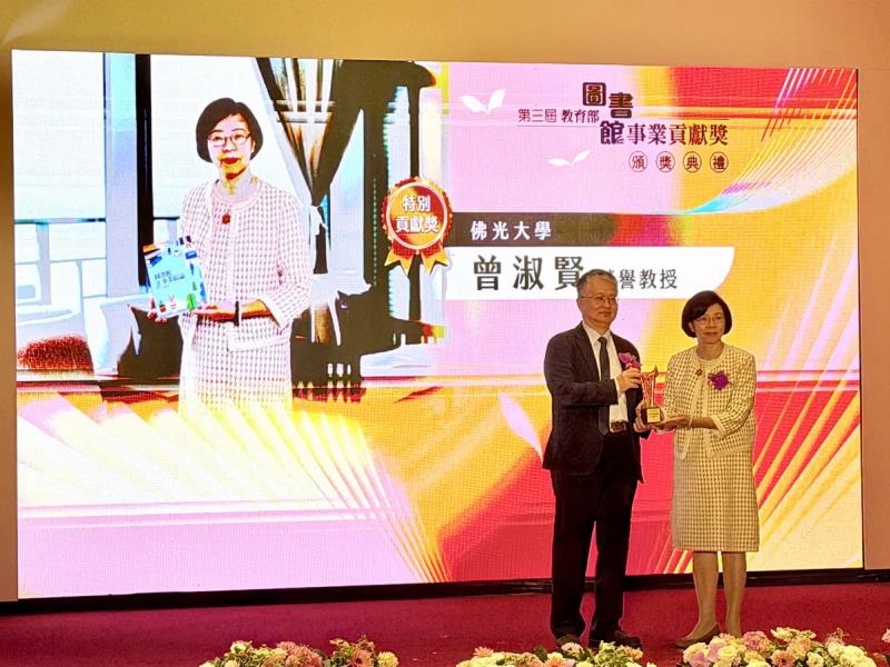 第三屆教育部圖書館事業貢獻獎今(16)日舉行頒獎典禮,佛光山佛光大學人文學院榮譽教授曾淑賢獲得特別貢獻獎,而她也是設置此獎項的幕後推手,「在圖書館事業經營多年,能學以致用很幸運,創生這個獎項是在體制內做事情,也希望多鼓勵投入圖書館事業的民間單位。」