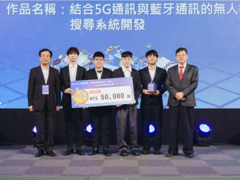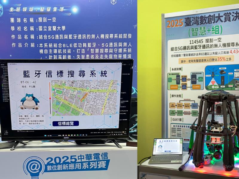 宜蘭大學電機工程學系無人機專題團隊「搜刮一空」於2025年參與兩場全國級大型競賽,表現亮眼:在 中華電信主辦之「2025年5G創新應用大賽」中,榮獲「最佳創意獎」與獎金新台幣5萬元;並於經濟部產業園區管理局指導的「2025臺灣數創大賞」智慧 組中入選為「佳作」隊伍,展現5G與AI技術在智慧生活與環境永續應用上的高度整合與實踐力。團隊由本系吳德豐教授與彭世興教授共同指導,成員包含李運昶、李承修、朱睿承、陳柏睿與江昶佑等五位同學,以作品「結合5G通訊與藍牙技術的無人機搜尋系統開發」為核心參賽主題,融合智慧通訊、邊緣運算與AI監控等跨域技術,打造出具備實用性與社會關懷價值的創新應用。