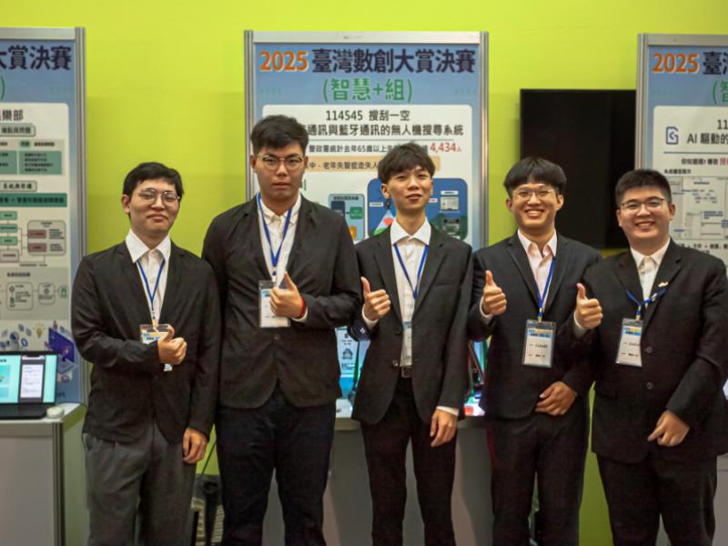 宜蘭大學電機系專題作品「結合5G通訊與藍牙通訊的無人機搜尋系統」,在2025臺灣數創大賞競賽會場團隊合影。