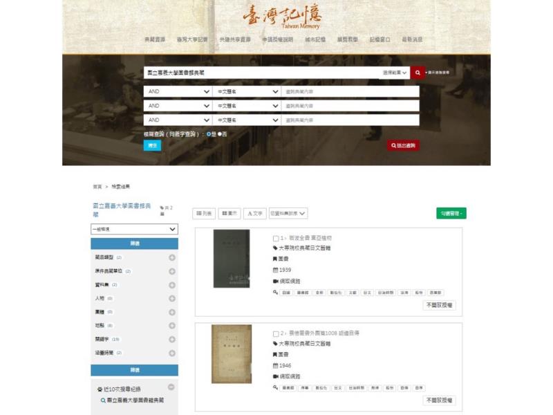圖2: 嘉大圖書館2冊日文舊籍典藏於國家圖書館之臺灣記憶系統。