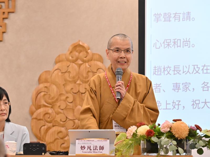 佛光山人間佛教研究院院長妙凡法師說明大會緣起與宗旨,人間佛教座談會始於2014年,由創院院長、星雲大師所發起,期搭起探討人間佛教與當代社會議題的平台。此次共30篇論文,40位國際學者發表,包含佛教、天主教、伊斯蘭教,從經典、藝術、社會學、翻譯、媒體等領域,探討AI時代下的宗教機遇與挑戰,另結合「AI工作坊─大型語言模組與佛學研究的應用」。