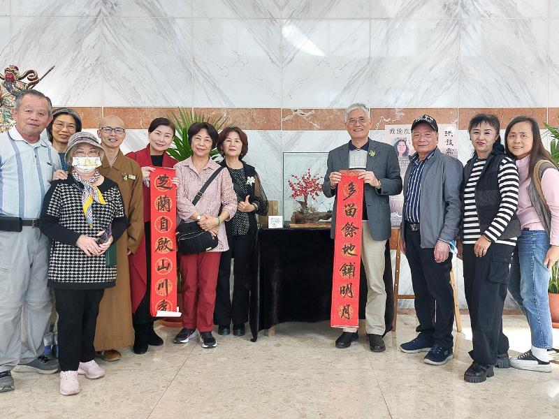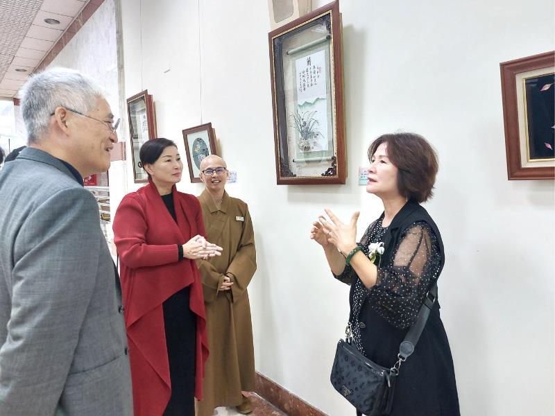 南華大學終身學習學院樂齡大學學員洪銀霜在嘉義市議會一樓文化走廊展出「纏花練禪心—洪銀霜纏花作品展」,於11月4日正式拉開序幕,展出至12月23日,共展出近40件精緻纏花作品。為表達對洪銀霜學員的肯定與祝福,南華大學校長高俊雄與副校長賴淑玲,以及承辦樂齡大學的終身學習學院院長知賢法師特別撥冗於12月18日前往嘉義市議會展場參觀展覽,並致贈南華大學創辦人星雲大師2026馬年一筆字春聯墨寶,為其祝福展覽「馬到成功」。除了學校師長蒞臨參觀,該校樂齡大學的學員們也到場相挺、支持觀展,並聆聽介紹,深入了解每幅作品背後的小故事和創作靈感。