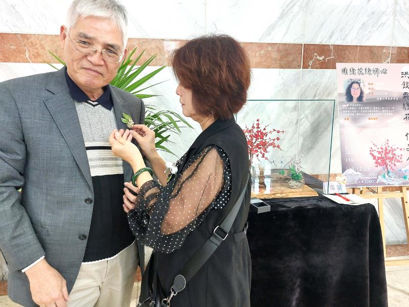南華樂齡大學學員洪銀霜,特別創作纏花胸針贈送給高俊雄校長、賴淑玲副校長及終身學院院長知賢法師,圖為洪銀霜(右)幫高俊雄校長(左)別上胸針。