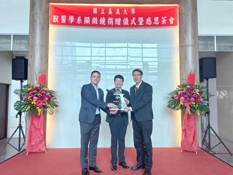 為提升嘉義大學獸醫學系教學設備與學習環境,培育兼具專業素養與社會責任感的獸醫人才,永鴻國際生技股份有限公司鍾威凱董事長、台灣維克法蘭斯股份有限公司動物保健處廖一名處長,攜手社團法人台灣嘉義大學獸醫校友會朱明泉理事長,12月19日在獸醫學系系館舉行光學顯微鏡捐贈儀式,共同捐贈30台光學顯微鏡,展現企業與校友長期支持高等教育與專業人才培育的具體行動。