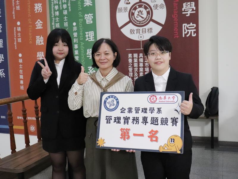 南華大學企管系舉辦管理實務專題競賽,第一名獲獎團隊與企管系袁淑芳主任合影。