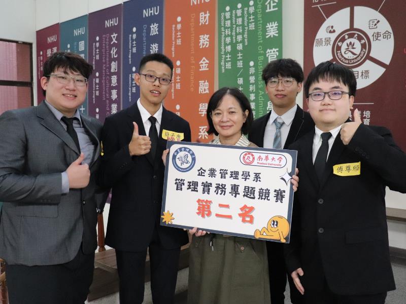 南華大學企管系舉辦管理實務專題競賽,第二名獲獎團隊與企管系袁淑芳主任合影。