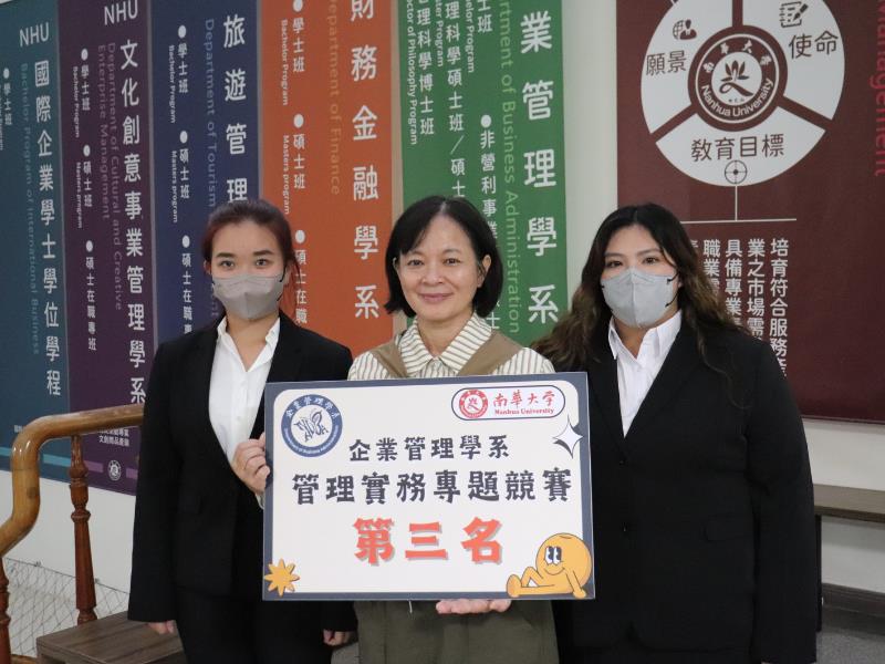 南華大學企管系舉辦管理實務專題競賽,第三名獲獎團隊與企管系袁淑芳主任合影。